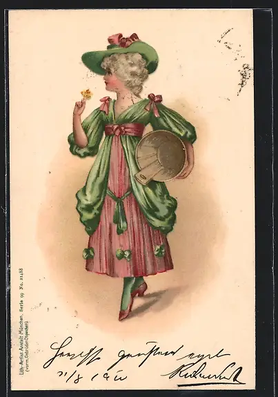 AK Dame im Kleid mit Hut, Jugendstil
