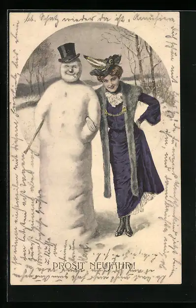 AK Dame im festlichen Gewand mit Schneemann