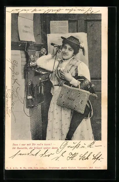 AK Dame im gemustertem Kleid mit Hut am Telefon