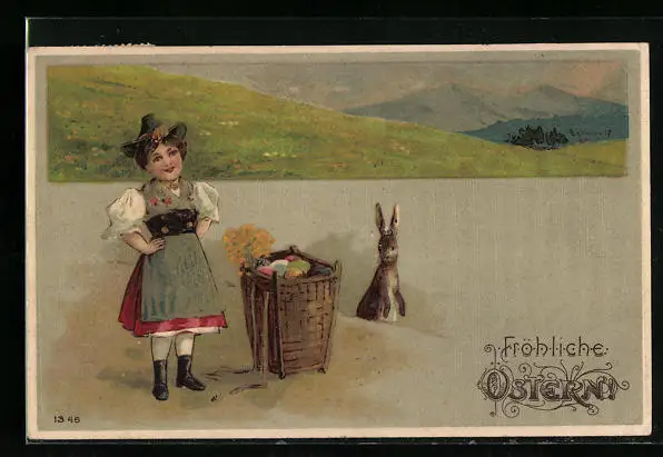 AK Dame in Tracht neben Osterhasen