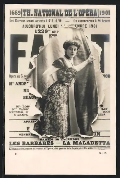 AK Dame in besticktem Kleid blickt durch durchlochte Zeitung