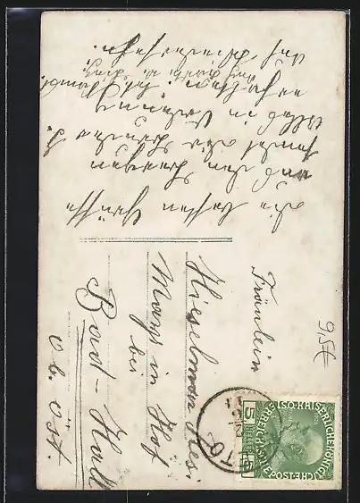 Personenbezogene Daten auf der Rückseite der Karte wurden durch blauen Textmarker unkenntlich gemacht. Die blauen Stellen sind auf die Vorderseite durchgeweicht und wirken sich negativ auf das Postkartenfoto aus