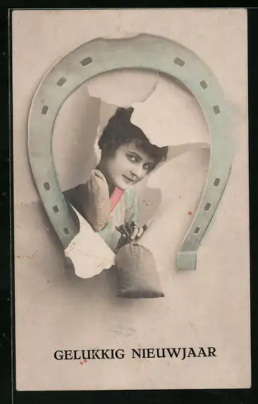AK Dame mit Geldsäcken und Hufeisen zum Neujahr