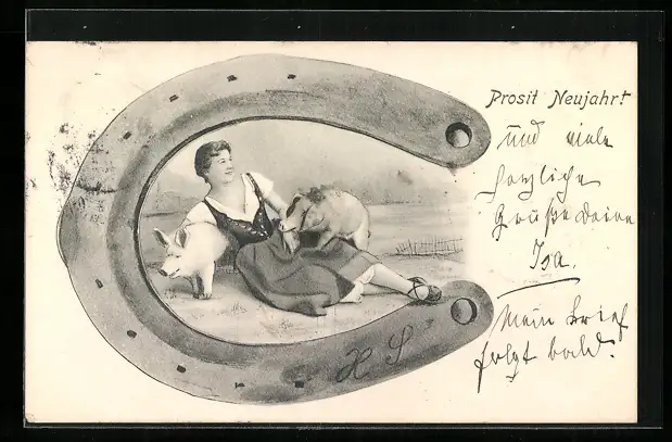 AK Dame mit Glücksschweinen, Hufeisen