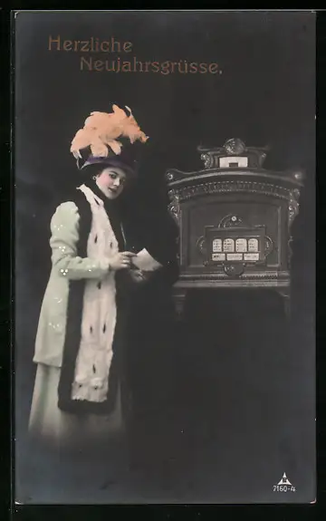 AK Dame mit Hut versendet Brief, Neujahrsgrüsse