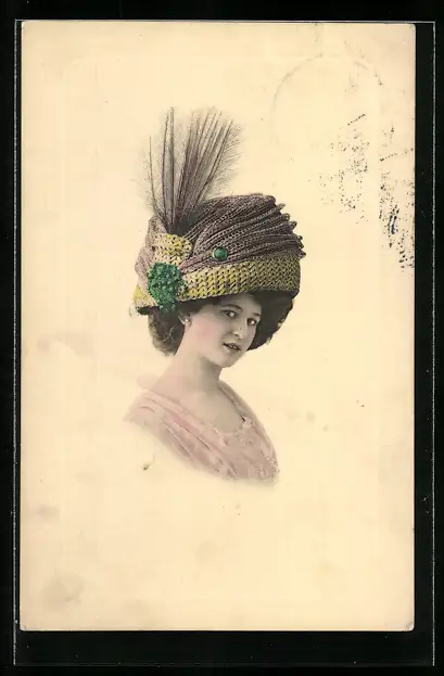 AK Dame mit Hut welcher mit Federn geschmückt ist