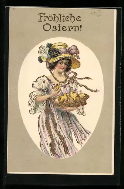 AK Dame mit Osterküken im Körbchen