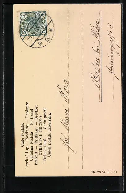 Personenbezogene Daten auf der Rückseite der Karte wurden durch blauen Textmarker unkenntlich gemacht. Die blauen Stellen sind auf die Vorderseite durchgeweicht und wirken sich negativ auf das Postkartenfoto aus