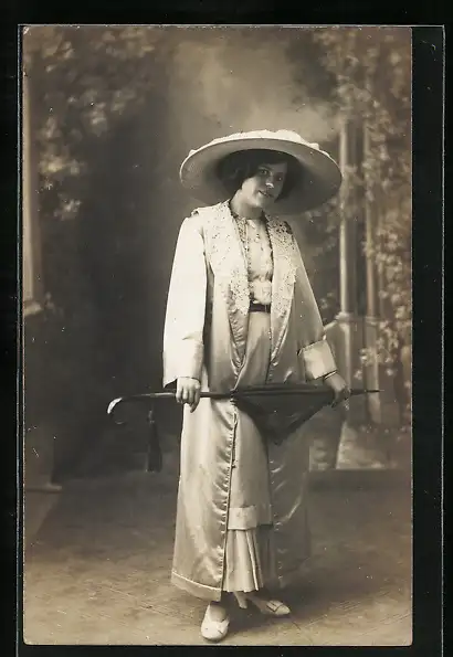 AK Dame mit Strohhut und Schirm