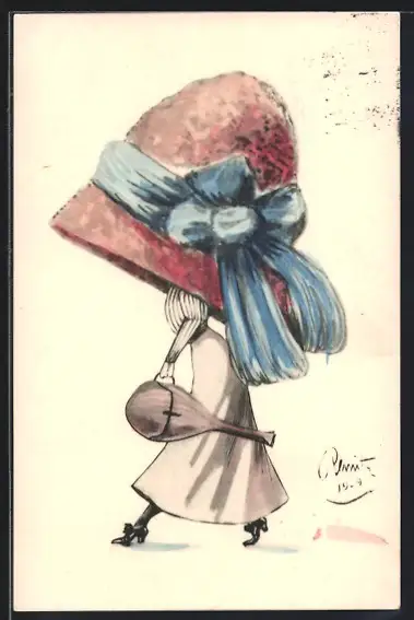 AK Dame mit übergrossem Hut und Lautengitarre, Mode