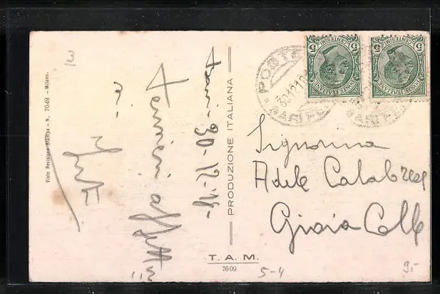 Personenbezogene Daten auf der Rückseite der Karte wurden durch blauen Textmarker unkenntlich gemacht. Die blauen Stellen sind auf die Vorderseite durchgeweicht und wirken sich negativ auf das Postkartenfoto aus