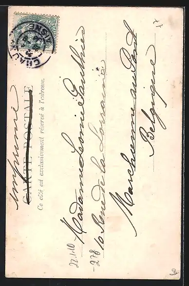 Personenbezogene Daten auf der Rückseite der Karte wurden durch blauen Textmarker unkenntlich gemacht. Die blauen Stellen sind auf die Vorderseite durchgeweicht und wirken sich negativ auf das Postkartenfoto aus