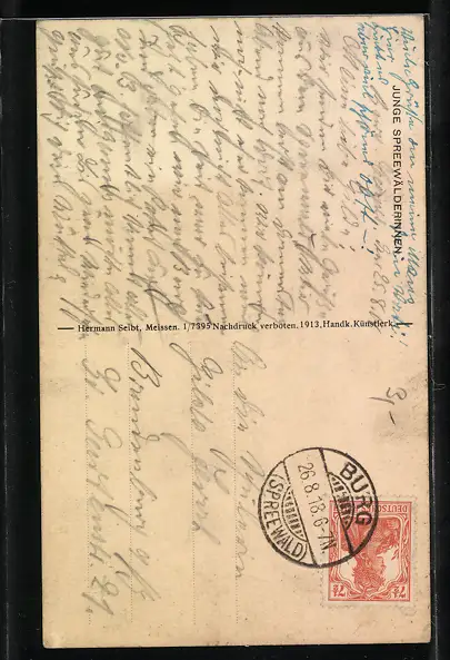 Personenbezogene Daten auf der Rückseite der Karte wurden durch blauen Textmarker unkenntlich gemacht. Die blauen Stellen sind auf die Vorderseite durchgeweicht und wirken sich negativ auf das Postkartenfoto aus