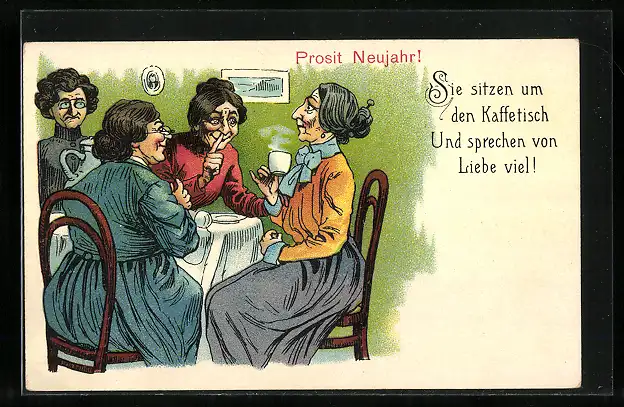 AK Damenkränzchen, frauenfeindlicher Humor, Neujahrsgruss