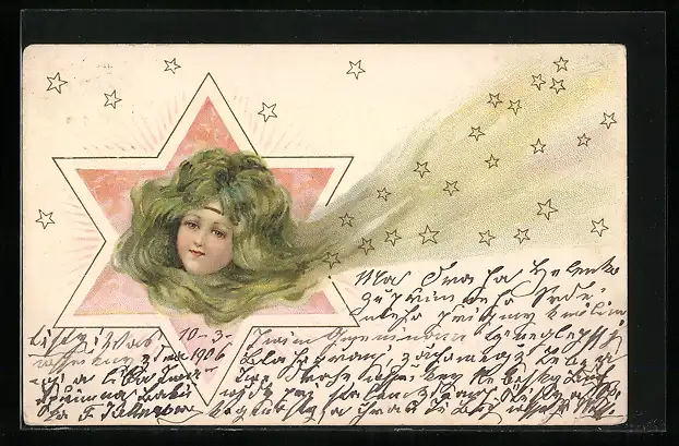 AK Damenportrait im Sternschnuppen-Passepartout, Jugendstil