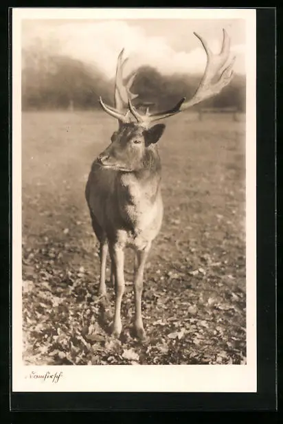 AK Damhirsch auf einer Weide, von vorn aufgenommen