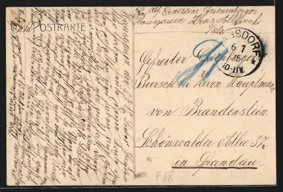 Personenbezogene Daten auf der Rückseite der Karte wurden durch blauen Textmarker unkenntlich gemacht. Die blauen Stellen sind auf die Vorderseite durchgeweicht und wirken sich negativ auf das Postkartenfoto aus