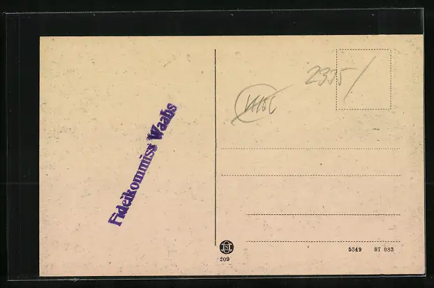 Personenbezogene Daten auf der Rückseite der Karte wurden durch blauen Textmarker unkenntlich gemacht. Die blauen Stellen sind auf die Vorderseite durchgeweicht und wirken sich negativ auf das Postkartenfoto aus
