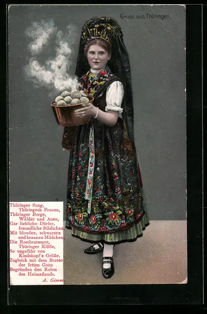 AK Dampfende Klösse von junger Frau serviert, in thüringischer Tracht