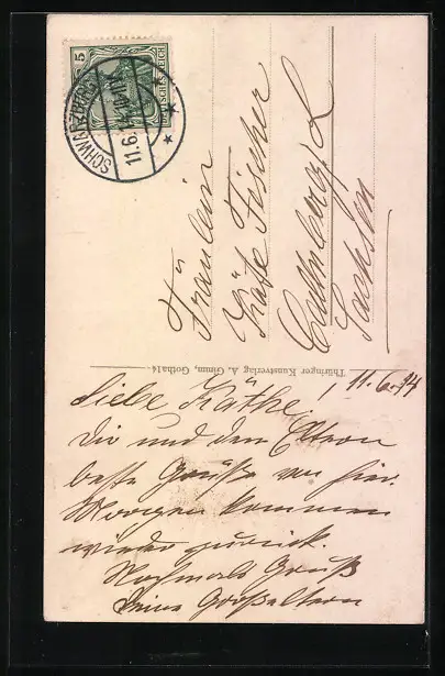 Personenbezogene Daten auf der Rückseite der Karte wurden durch blauen Textmarker unkenntlich gemacht. Die blauen Stellen sind auf die Vorderseite durchgeweicht und wirken sich negativ auf das Postkartenfoto aus