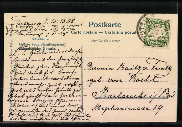 Personenbezogene Daten auf der Rückseite der Karte wurden durch blauen Textmarker unkenntlich gemacht. Die blauen Stellen sind auf die Vorderseite durchgeweicht und wirken sich negativ auf das Postkartenfoto aus