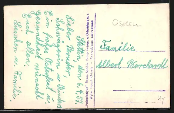 Personenbezogene Daten auf der Rückseite der Karte wurden durch blauen Textmarker unkenntlich gemacht. Die blauen Stellen sind auf die Vorderseite durchgeweicht und wirken sich negativ auf das Postkartenfoto aus