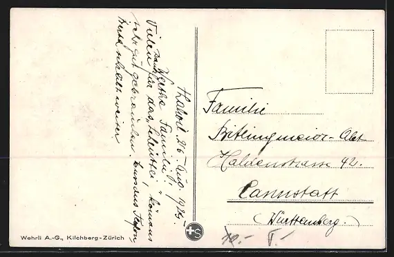Personenbezogene Daten auf der Rückseite der Karte wurden durch blauen Textmarker unkenntlich gemacht. Die blauen Stellen sind auf die Vorderseite durchgeweicht und wirken sich negativ auf das Postkartenfoto aus