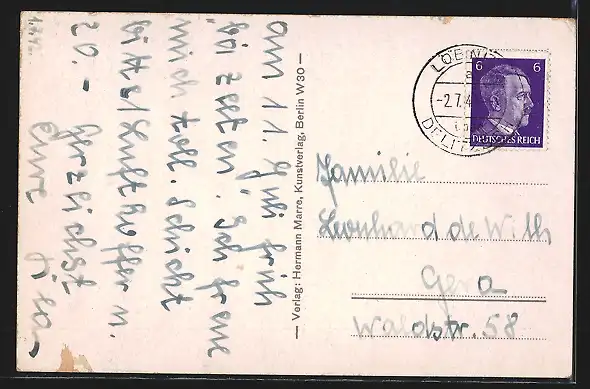 alte Ansichtskarte, gelaufen 1942, rückseitig Oberflächenschaden, guter Zustand