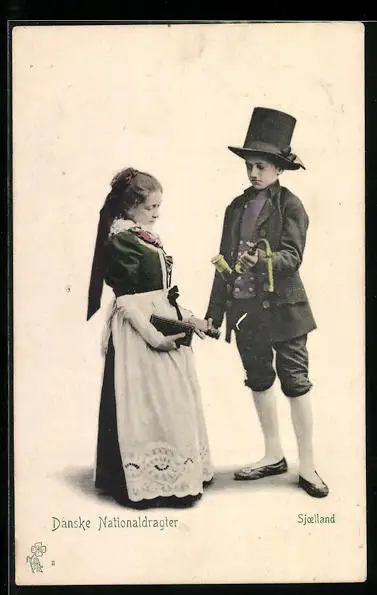 AK Danske Nationaldragter, Sjoelland, Kinderpaar in Tracht