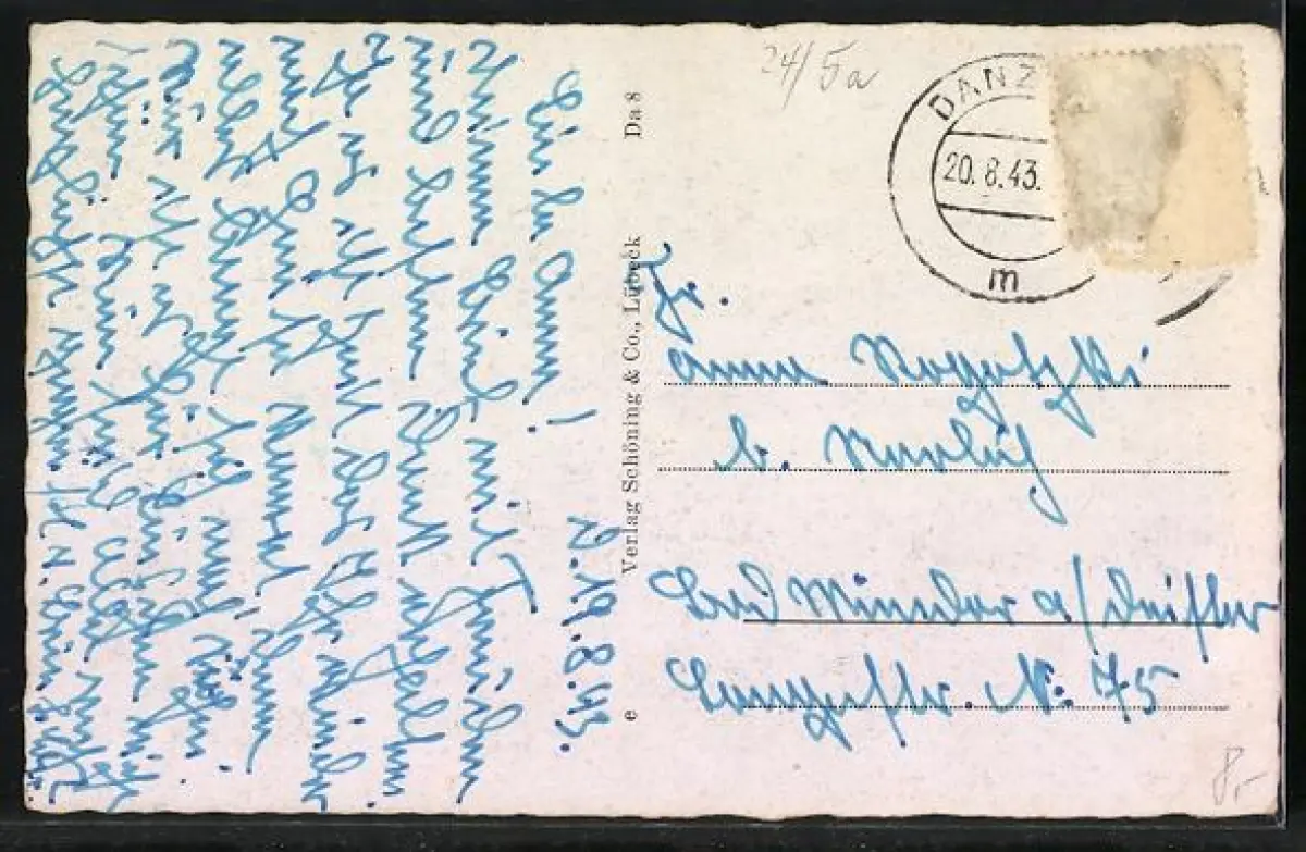 alte Ansichtskarte, gelaufen 1943, Briefmarke entfernt, rückseitig Oberflächenschaden, guter Zustand