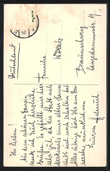 alte Ansichtskarte, gelaufen, Briefmarke entfernt, rückseitig Oberflächenschaden, Stempelspur, guter Zustand