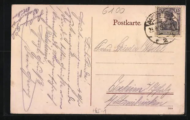 Personenbezogene Daten auf der Rückseite der Karte wurden durch blauen Textmarker unkenntlich gemacht. Die blauen Stellen sind auf die Vorderseite durchgeweicht und wirken sich negativ auf das Postkartenfoto aus