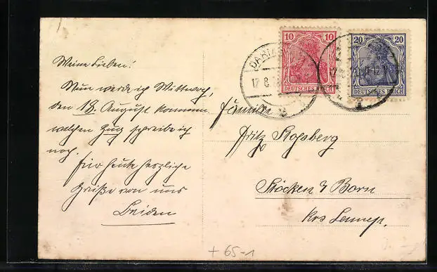 Personenbezogene Daten auf der Rückseite der Karte wurden durch blauen Textmarker unkenntlich gemacht. Die blauen Stellen sind auf die Vorderseite durchgeweicht und wirken sich negativ auf das Postkartenfoto aus