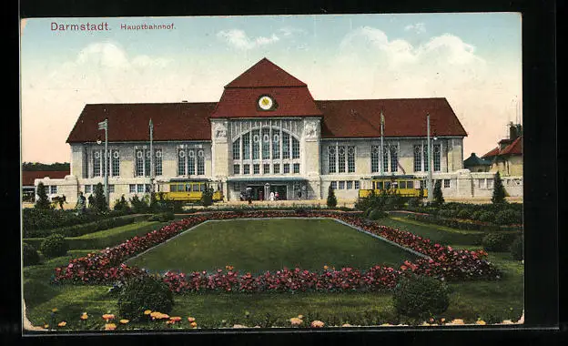 AK Darmstadt, Hauptbahnhof mit Strassenbahnen