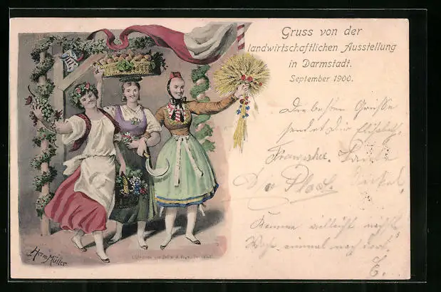 AK Darmstadt, Landwirtschaftl. Ausstellung 1900, Frauen mit Obst
