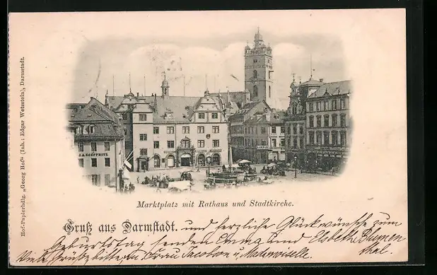 AK Darmstadt, Marktplatz mit Stadtkirche und Rathaus