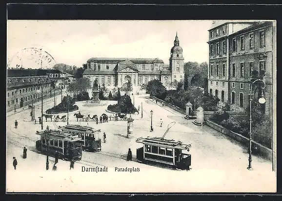 AK Darmstadt, Paradeplatz mit Denkmal und Strassenbahn