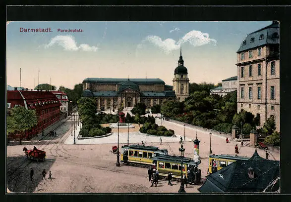 AK Darmstadt, Paradeplatz mit Strassenbahnen