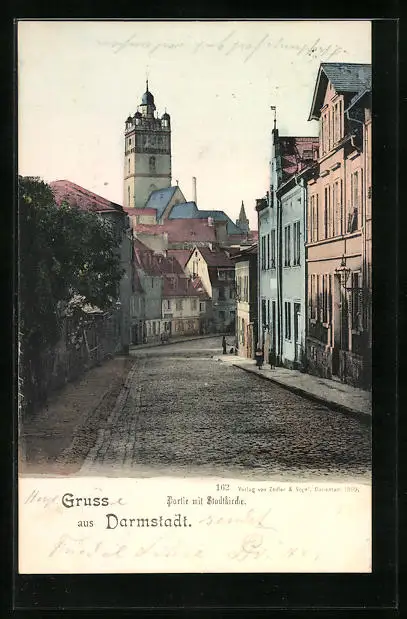 AK Darmstadt, Strassenpartie mit Stadtkirche