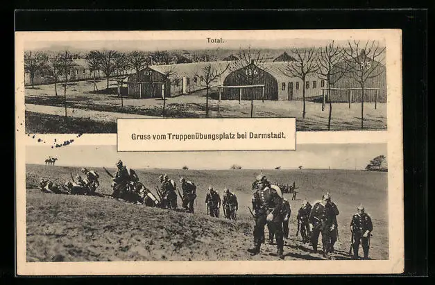 AK Darmstadt, Totalansicht des Truppenübungsplatz, Soldaten in Uniform bei der Übung
