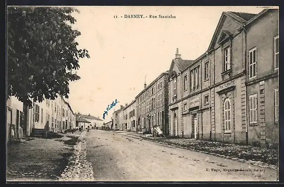 AK Darney, Rue Stanislas avec bâtiments historiques et rue pavée