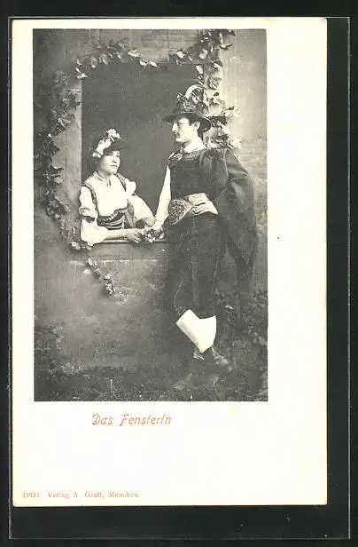 AK Das Fensterln, Herr steht bei einer Dame am Fenster