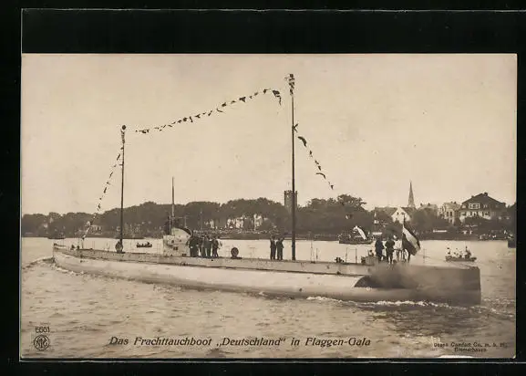 AK Das Frachttauchboot Deutschland in Flaggengala