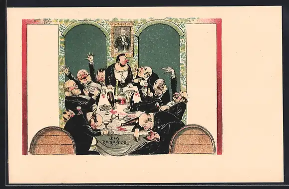 AK Das Rathsstubl, Betrunkene zwischen Fässern
