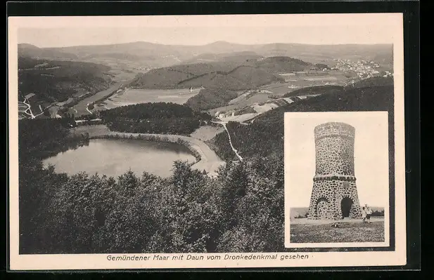 AK Daun, Gemündener Maar mit Stadt vom Dronkedenkmal gesehen