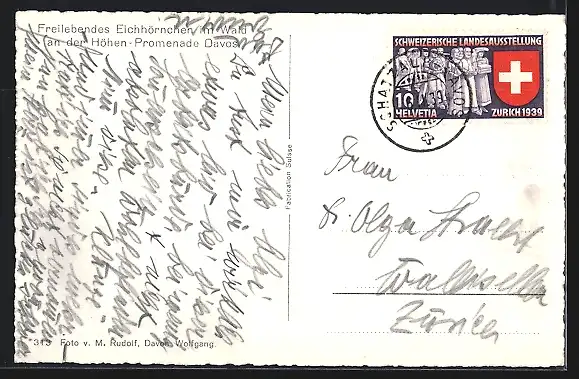 Personenbezogene Daten auf der Rückseite der Karte wurden durch blauen Textmarker unkenntlich gemacht. Die blauen Stellen sind auf die Vorderseite durchgeweicht und wirken sich negativ auf das Postkartenfoto aus