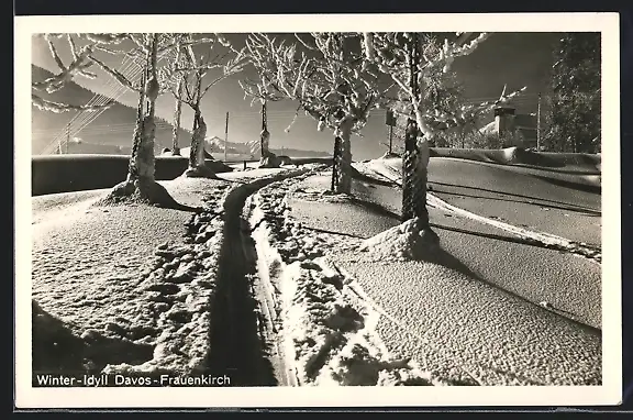 AK Davos-Frauenkirch, Winter-Idyll zwischen schneebedeckten Bäumen