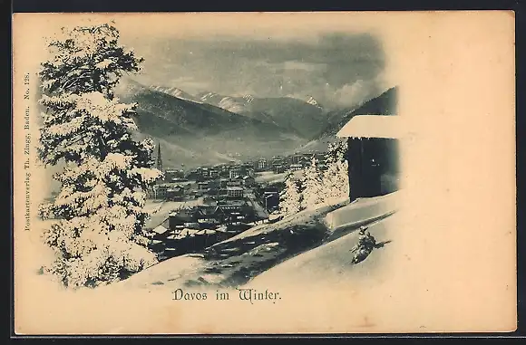AK Davos, Ortsansicht mit Bergblick im Winter