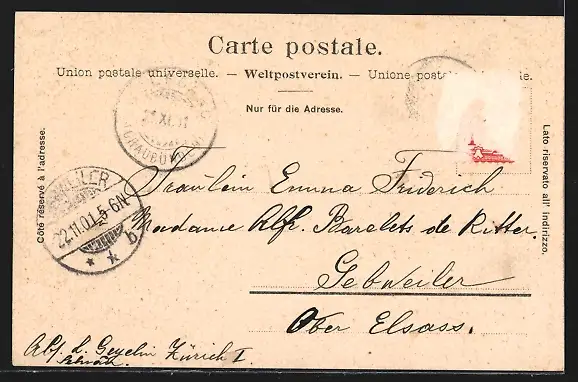 alte Ansichtskarte, gelaufen 1901, Briefmarke entfernt, rückseitig Oberflächenschaden, guter Zustand