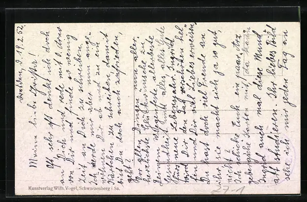 Personenbezogene Daten auf der Rückseite der Karte wurden durch blauen Textmarker unkenntlich gemacht. Die blauen Stellen sind auf die Vorderseite durchgeweicht und wirken sich negativ auf das Postkartenfoto aus